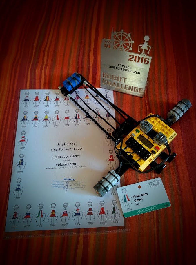 Per il quarto anno consecutivo, il team italiano ItLUG ha partecipato alla competizione robotica “Robotchallenge” che si è svolta a Vienna (12-13 Marzo 2016). L’altissimo livello internazionale è stato confermato dalla presenza di 645 robots e più di 800 partecipanti provenienti da 39 paesi di tutto il mondo. Il team ItLUG, con familiari al seguito, era composto dalle famiglie Padovan e Cadei. Il nostri piccolo team, composto da solo 5 persone, ha comunque ottenuto un risultato eccezionale, riuscendo a conquistare complessivamente due medaglie d’oro, due di bronzo e un meritatissimo quarto posto nel medagliere finale. Le medaglie sono state conquistate nelle categorie LEGO Line Follower (robot costruiti esclusivamente con pezzi LEGO) e Nano Sumo (non LEGO). Per i risultati potete guardare qui “Risultati 2016”.